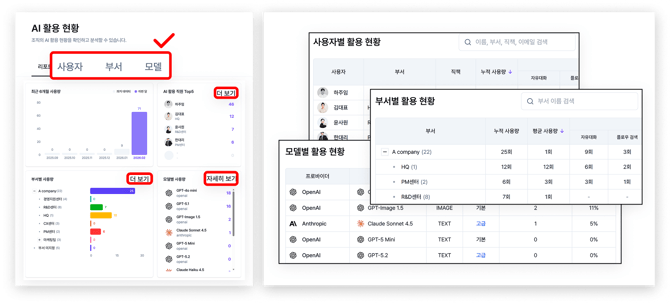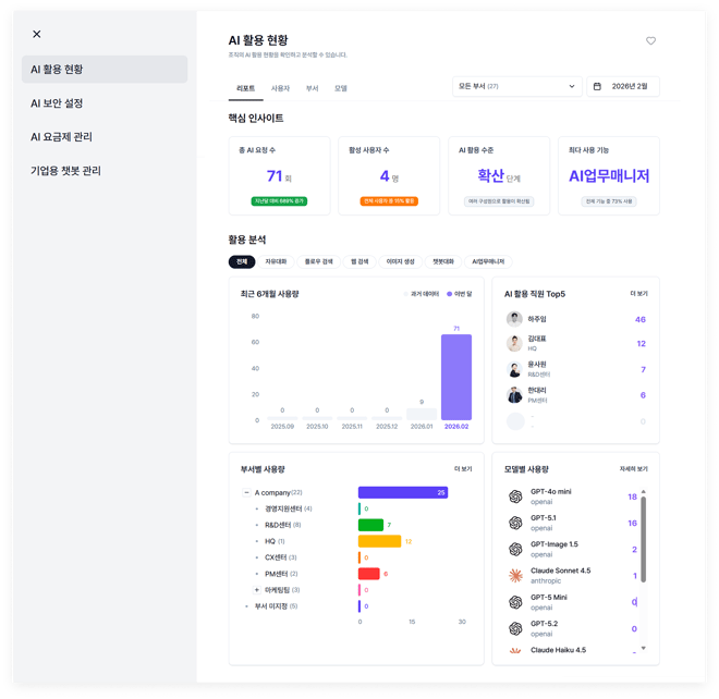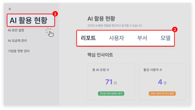 '리포트' 탭에서 우리 회사에서 플로우 AI를 이용한 내역의 핵심 인사이트와 사용 추이를 한눈에 볼 수 있습니다. 기능별 활용 분석은 물론 부서별 / 모델별 사용량이 총망라됩니다.