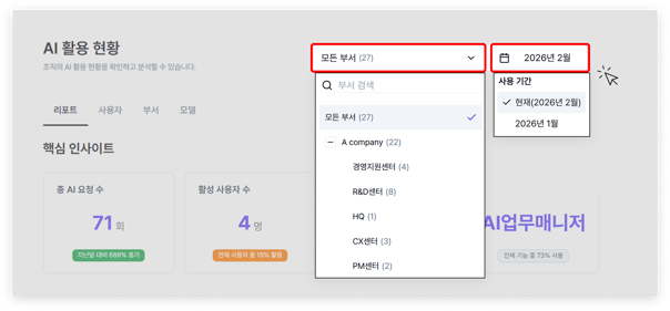 - 우측 상단에서 부서 범위, 기간(월 단위)을 선택해 통계 범위를 세부적으로 조정할 수 있습니다. 특히 기업 내 조직도 기능이 활성화 된 경우, 상위 부서를 펼쳐 하위 부서까지 확인 가능합니다.