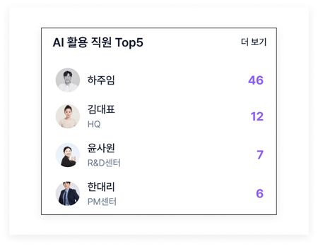 - 'AI 활용 직원 Top5' 통계를 중점으로 참고하여 잘 운영하면 도입 및 활용 효과가 극대화됩니다.