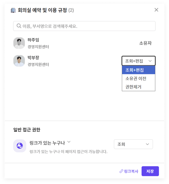 | 관리자 권한 | 수정 및 공유 대상/권한 설정 변경 가능 | 팀 리더, 문서 최종 관리자 |