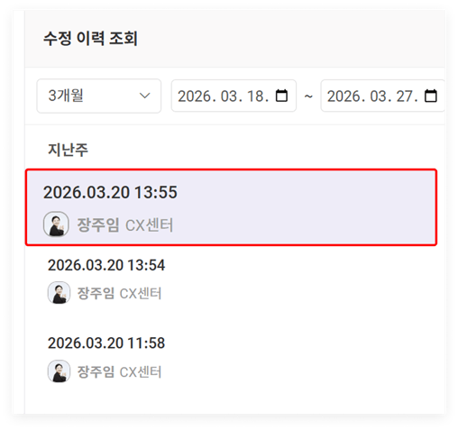 우측 사이드바의 '수정 이력 조회' 목록에서 날짜와 시간으로 저장된 [버전]을 클릭하면, 그 당시 작성되었던 문서 전체 내용이 본문에 미리보기로 표시됩니다. 특히 해당 시점에 문서를 함께 편집했던 팀원들의 프로필이 나타나 누가 언제 어떤 내용을 보완했는지 협업의 맥락을 한눈에 파악할 수 있습니다.