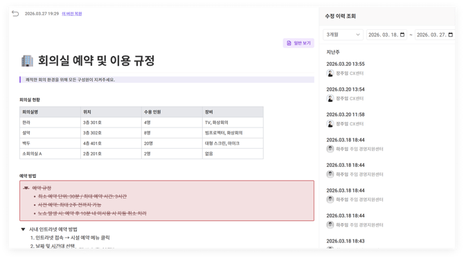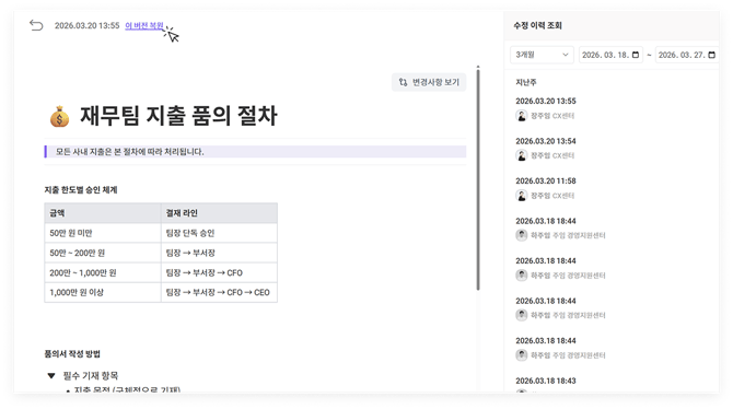 - 편집/관리자 권한: 문서 편집은 물론, 버전 열람 및 데이터 복구가 모두 가능합니다.