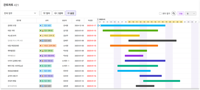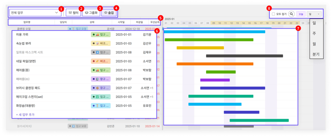 ⑦ 차트(bar) 영역 : 업무 게시물에 지정되어 있는 시작일 / 마감일 기준으로 막대(bar) 모양의 차트가 생성되는 영역입니다. 색상은 각 업무의 상태에 맞게 적용되며, 마우스로 마감일을 직접 조정할 수도 있습니다.