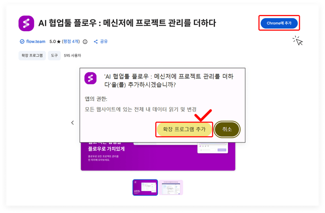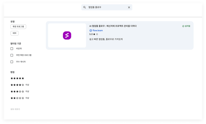 1) 크롬 웹 스토어에서 '협업툴 플로우'를 검색하여 플로우 확장 프로그램을 클릭합니다.