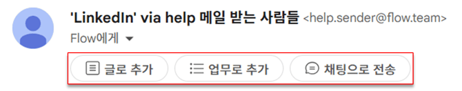 4) 받은 편지함으로 들어가서 원하는 이메일을 선택하고 아래 세 개의 버튼이 설치되었는지 꼭 확인해 주세요! 세 개의 버튼 중 플로우에 전송하거나 추가하고 싶은 항목을 꼭 선택을 하셔야 크롬 익스텐션을 통해 등록이 가능합니다.