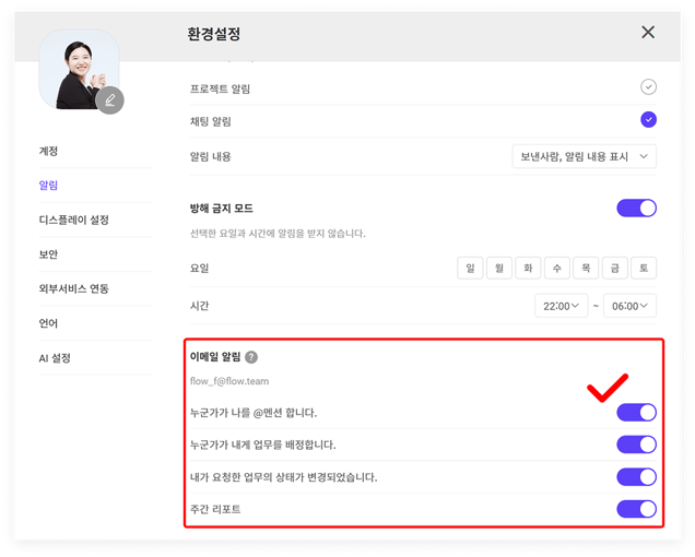 - 플로우 접속 후, 오른쪽 상단의 프로필을 눌러 [환경설정] > [알림] 으로 이동하여 설정 가능합니다.