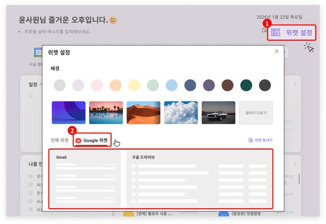 대시보드 우측 상단에 있는 '위젯 설정' 버튼을 누른 후, 구글 워크스페이스 위젯 3가지(지메일 / 구글 드라이브 / 구글 캘린더)를 추가해보세요.