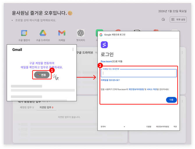 구글 워크스페이스 위젯을 통해 이메일, 파일, 일정 등을 플로우 대시보드에서 손쉽게 확인하고 관리하며 업무 효율성을 더욱 높여보세요! 🙏🏻