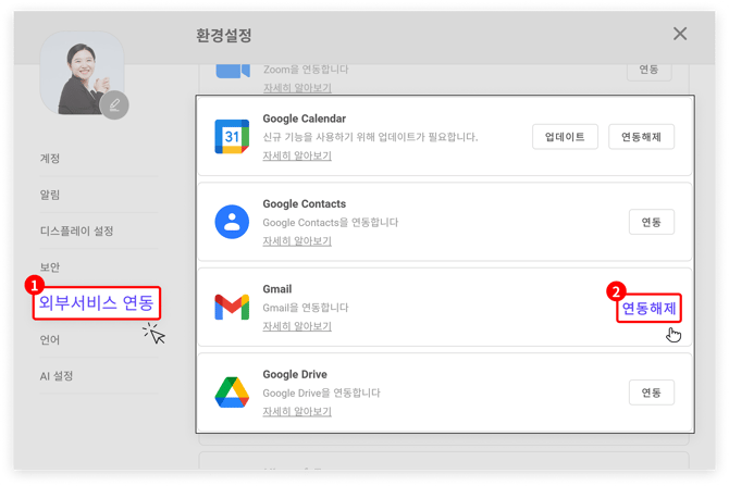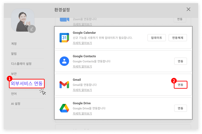 [프로필 - 환경설정 - 외부 서비스 연동] 에 있는 '연동' 버튼을 눌러 구글 계정을 연동 할 수 있습니다.