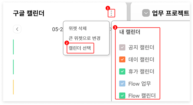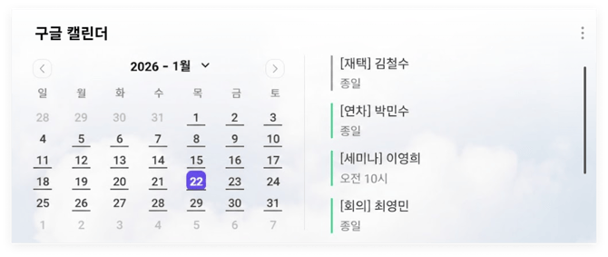 연동된 구글 캘린더의 일정들을 플로우 대시보드 위젯에서 간편하게 확인할 수 있습니다.