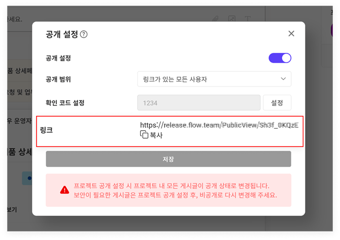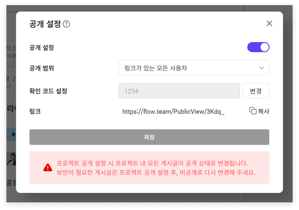프로젝트 및 게시물에 대한 외부 공개 범위를 설정하는 기능입니다. 해당 기능을 이용하면 플로우에 가입되어 있지 않은 사용자에게도 게시물 링크를 통해 내용을 공유할 수 있습니다.