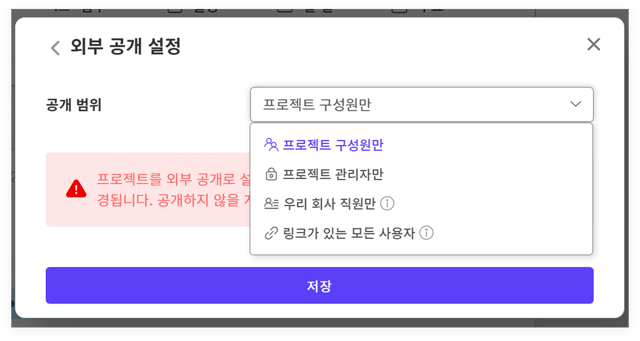 프로젝트 이름 좌측에 있는 더보기(···) 버튼을 누른 후, 외부 공개 설정 버튼을 클릭한 다음 원하는 공개 범위를 설정 할 수 있습니다. 활성화 시 프로젝트 내 모든 게시물의 설정값이 변경됩니다.