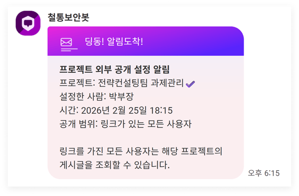 - 프로젝트 외부 공개를 설정하면 회사 관리자에게 공개 설정이 되었다는 알림이 발송됩니다.
