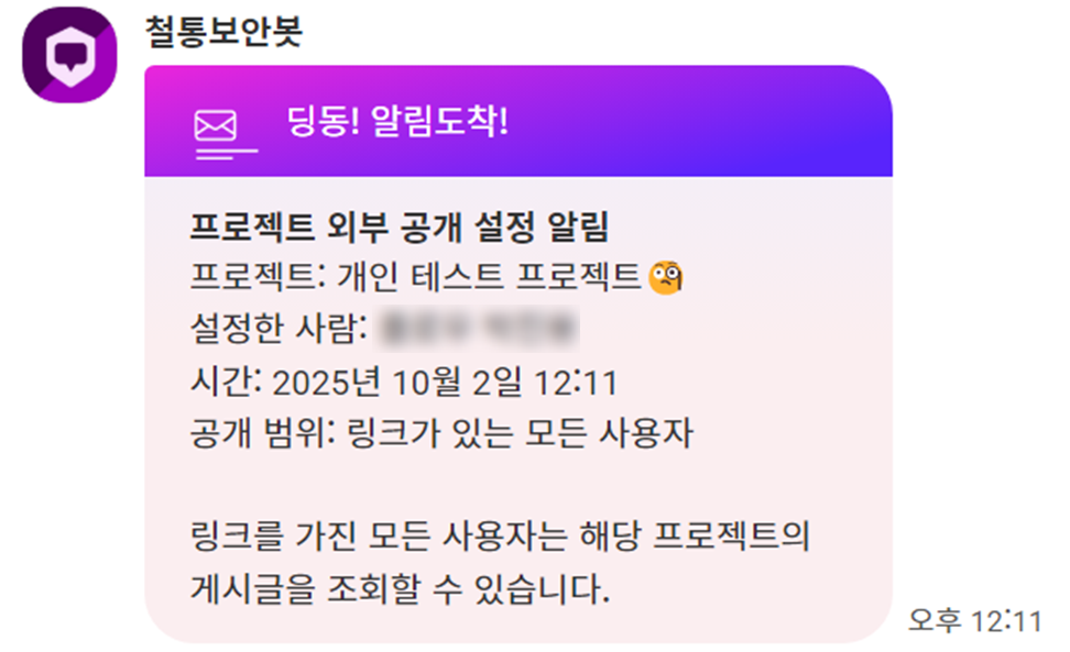 2) 프로젝트 외부 공개를 설정하면 회사 관리자에게 공개 설정이 되었다는 알림이 발송됩니다.
