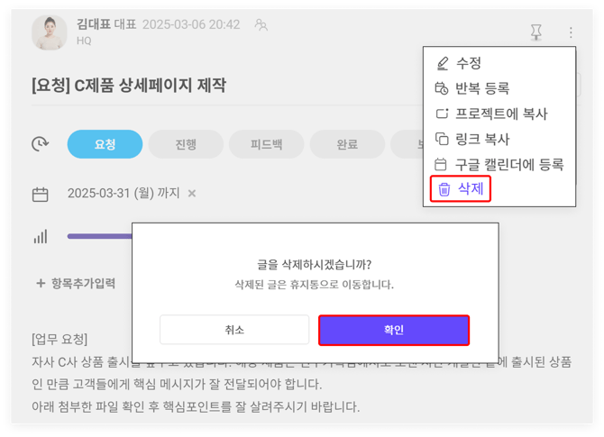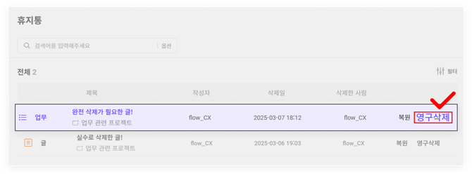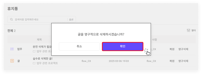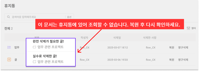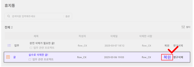 * 예시: 수정 권한이 '프로젝트 관리자 + 작성자만'으로 설정된 프로젝트에서 삭제된 게시물은, 프로젝트 관리자 및 게시글을 작성한 담당자 모두 복원 / 영구 삭제가 가능