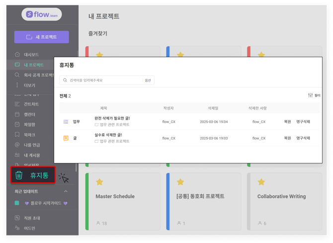프로젝트에서 작성한 '글 / 업무 / 일정 / 할일 / 투표' 게시물을 삭제하면 휴지통으로 이동합니다.