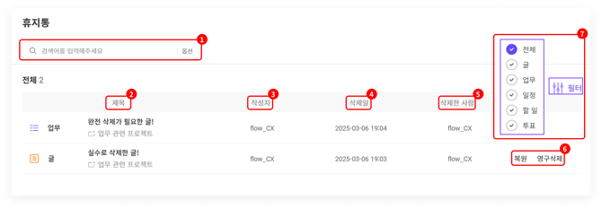 ① 휴지통 내 검색창 (작성자, 검색 기간 등 옵션 설정 후 검색 가능)