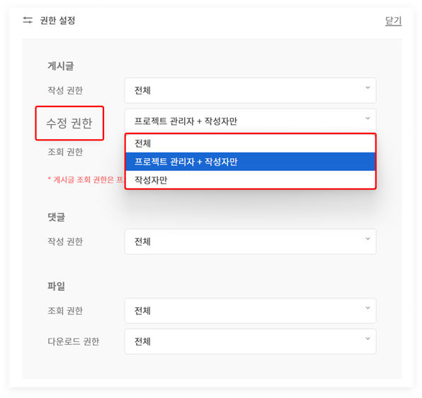 ‘게시물 복원 / 영구 삭제 권한’은 해당 게시물이 위치하던 프로젝트의 ‘수정 권한(자세히 보기)'과 동일합니다.