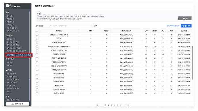 - 프로젝트명 / 관리자 / 외부인 수 / 프로젝트 만든이 / 등록된 게시물 및 파일 수 / 최근 활동일 등, 프로젝트와 관련된 간단한 정보를 한 눈에 확인할 수 있습니다.