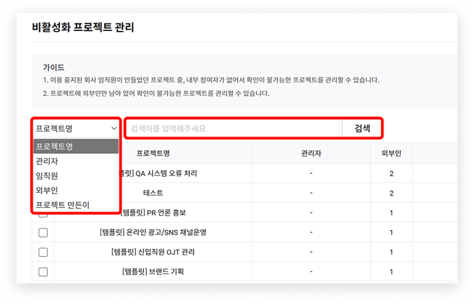 - 참여자가 0명이거나 외부인만 참여자로 남아있는 프로젝트의 경우, '비활성화 프로젝트 관리'에서 모아서 확인할 수 있습니다.