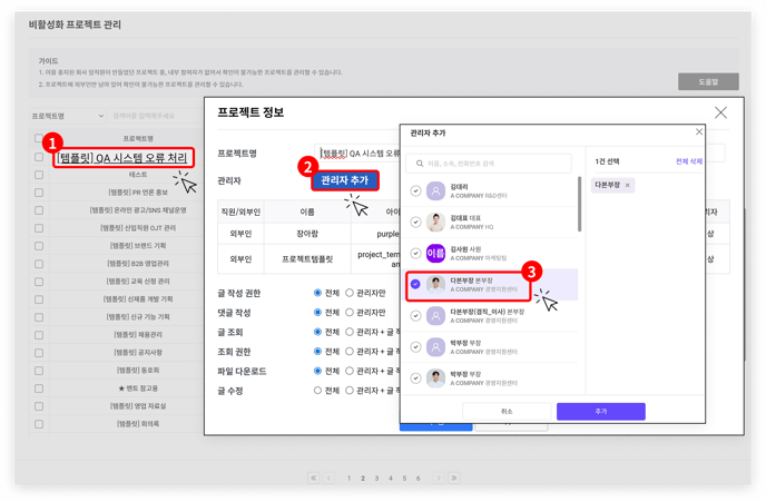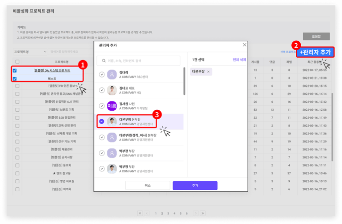 3) 우리 회사 임직원 중, 관리자로 추가할 직원을 1명 이상 선택한 후 '추가'를 누르면 프로젝트 내 새로운 관리자 참여 및 지정이 완료됩니다.