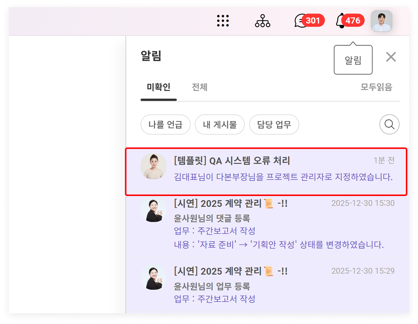 프로젝트의 새로운 관리자로 추가된 임직원은, 본인의 플로우 화면 우측 상단 '알림리스트' 영역에 알림이 새롭게 발생합니다. 이로써 새롭게 참여된 프로젝트 정보를 확인할 수 있습니다.