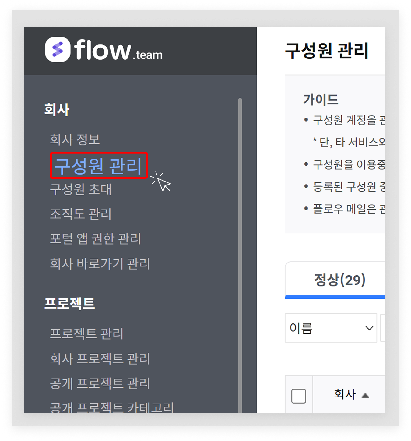 - 어드민 메뉴 좌측 에서 '구성원 관리'를 선택합니다.