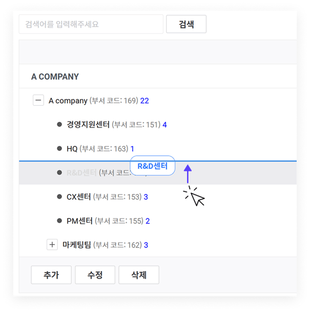 '추가' 버튼을 누른 후, 부서 정보를 1개씩 추가할 수 있습니다. 등록 후 마우스 드래그로 부서 순서 및 소속을 쉽게 변경할 수 있습니다. -png.png?width=2080&height=998&name=Group%201410105899%20(1)-png.png)