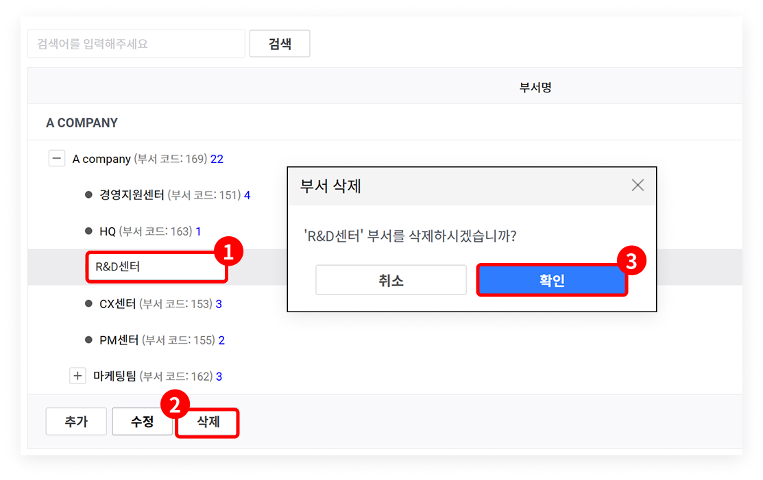 삭제가 필요한 부서(팀)를 선택한 후 '삭제'를 클릭하면, 부서(팀)를 삭제할 수 있습니다.
