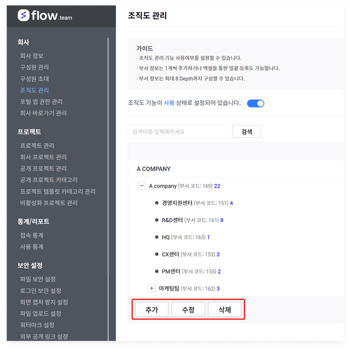 등록된 조직도 정보는 '조직도 관리'에서 확인할 수 있습니다. 입력한 정보에 맞게 등록이 되었는지 최종 확인합니다. 수정이 필요한 경우 '추가/수정/삭제'를 선택하여 변경할 수 있습니다.